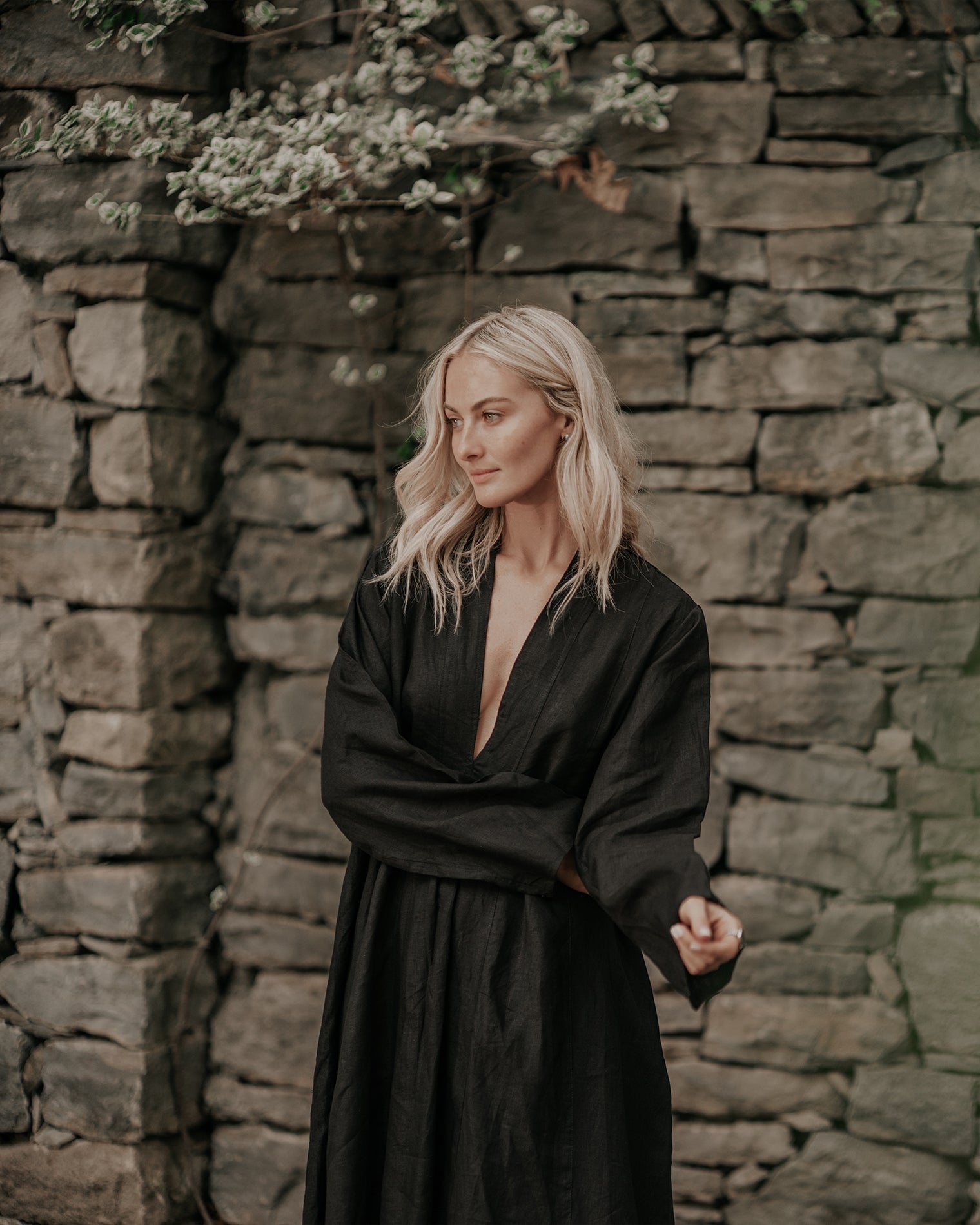 - The Jaipur Nap Dress is the perfect combination of comfort and sophistication. Crafted from a lightweight black linen handloom fabric, it features a flowing design that drapes gracefully and provides maximum comfort throughout the day. Boasting hidden pockets on each side and a v-neck style, this dress is an all-in-one.